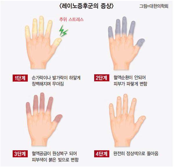 손‧발이 차가운 수족냉증은 겨울철에 많은 사람이 흔하게 호소하는 증상입니다. 하지만 단순한 손‧발 차가움에 더해서 손‧발끝의 색깔 변화와 감각 이상, 통증까지 동반되면 ‘레이노 증후군’을 의심해야 합니다.
